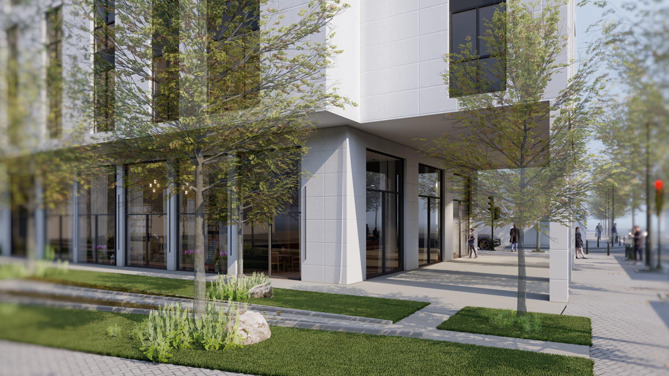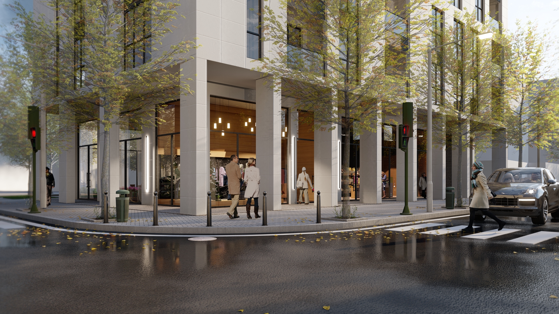 The ground floor is dedicated to commercial spaces, featuring double-height shopfronts with transparent glazing that enhance visibility and create an inviting pedestrian experience. Set back columns frame the retail units, giving rhythm to the street frontage while providing sheltered arcades for walking and social interaction. Warm interior lighting and wood finishes inside the shops contrast with the sleek exterior, making the commercial level a lively urban anchor.