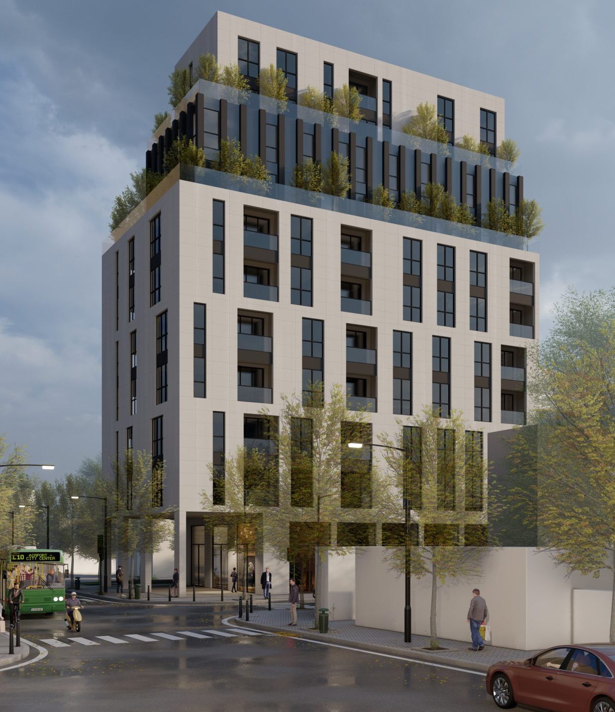 Above, the residential units extend across multiple floors, each with balconies and full-height windows that ensure natural light and outdoor living. The upper levels introduce green terraces and planted balconies, softening the verticality and adding a sustainable, biophilic character.