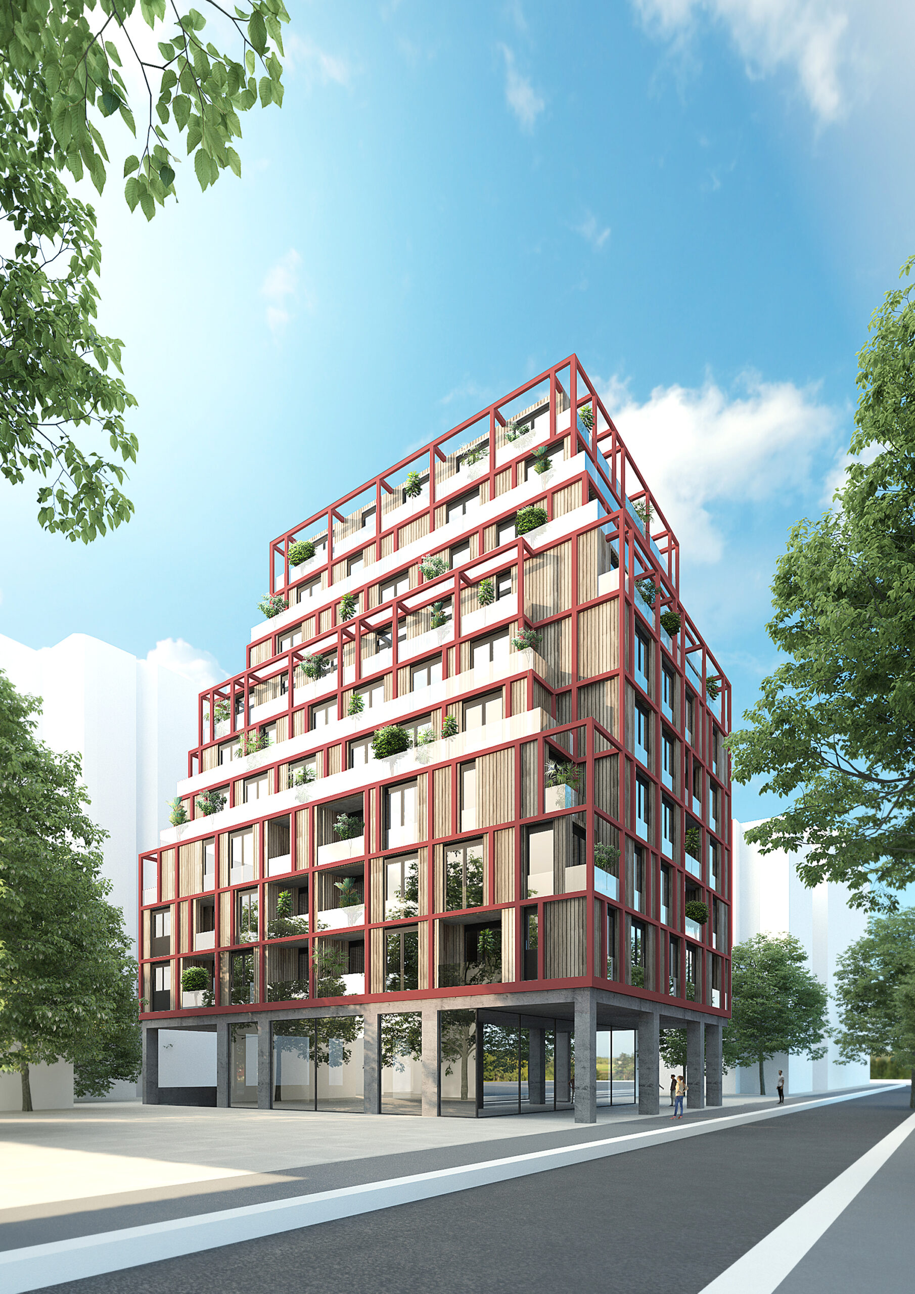 Eco Axis is a contemporary residential building that redefines urban living through a synthesis of geometry, sustainability, and human comfort. The architectural composition is structured around a bold red grid that frames large glass openings and vertical wooden panels, creating rhythm and warmth within the city fabric. The stepped upper volumes introduce terraces and green insertions, ensuring natural light and outdoor continuity for every floor.
