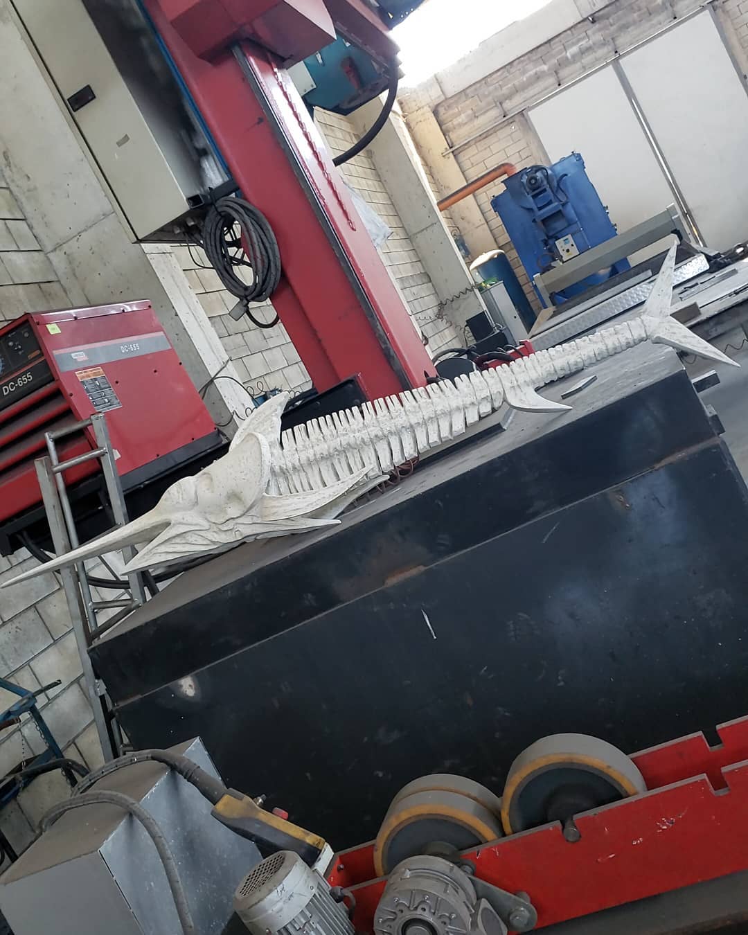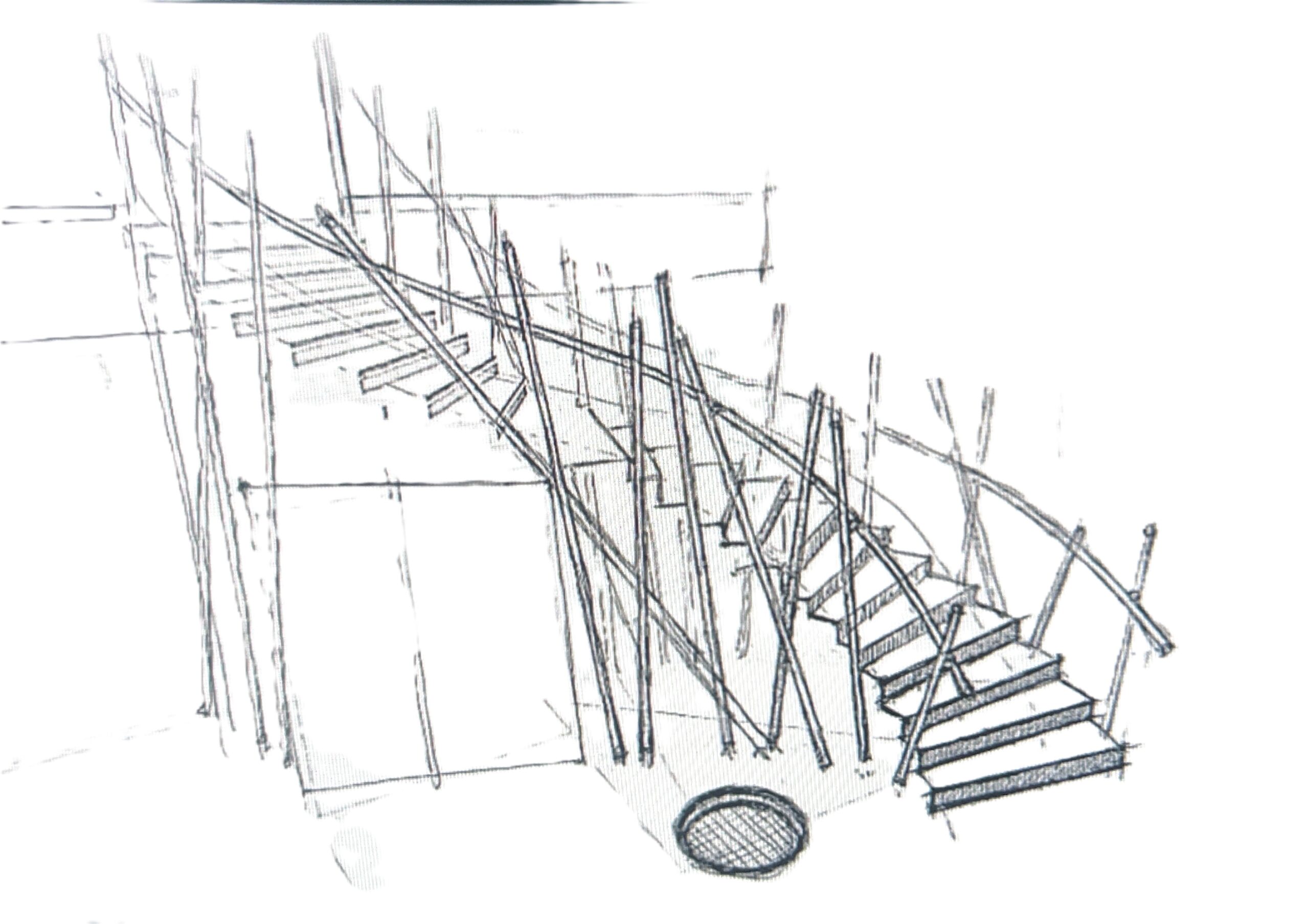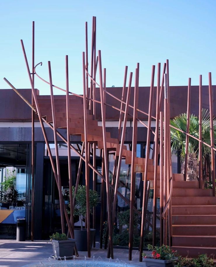 The restaurant’s defining gesture is a sculptural staircase fabricated in weathering steel (Corten), rising organically from the terrace. Its sinuous form engages in a dynamic interplay with a series of slender oxidized rods, rhythmically arranged to evoke a grove of abstracted trees. The rust-hued patina of the metal lends a rich, timeworn character to the intervention, integrating the architecture within its natural context while asserting a strong contemporary presence. Far beyond a functional connector, the stair operates as a spatial landmark anchoring the project with symbolic clarity and sculptural resolve.