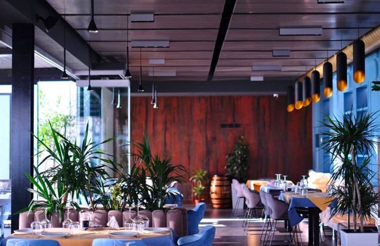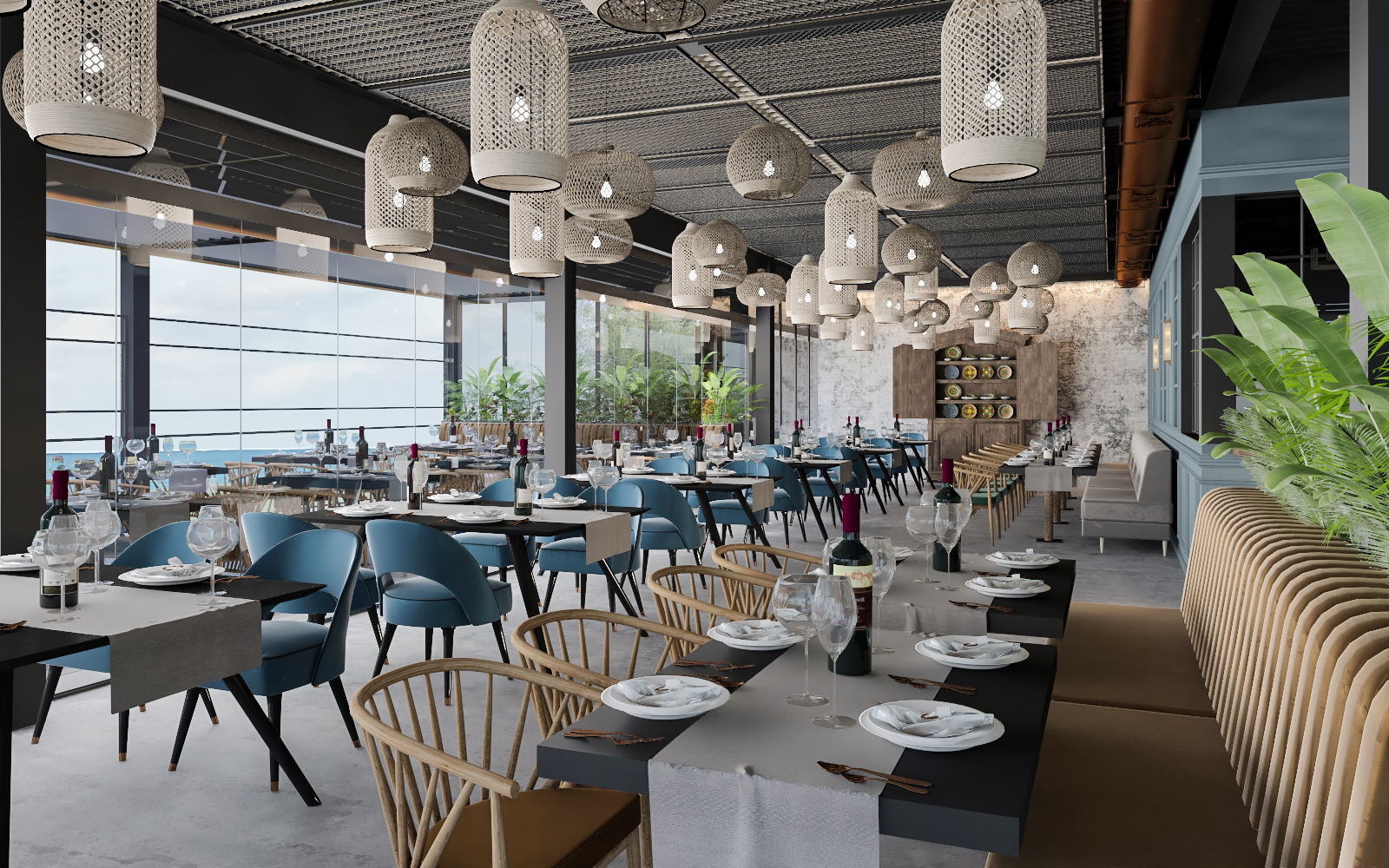 The dining area is curated as a material and chromatic dialogue. Custom-designed blue-toned upholstery contrasts with natural wood seating, crafting a palette that references both maritime tones and organic tactility. Overhead, a constellation of handwoven rattan pendants, each unique in form, cascades softly from the ceiling, creating a floating canopy of diffused warm light. This ensemble tempers the linearity of the architectural elements, fostering an atmosphere that is both composed and inviting.