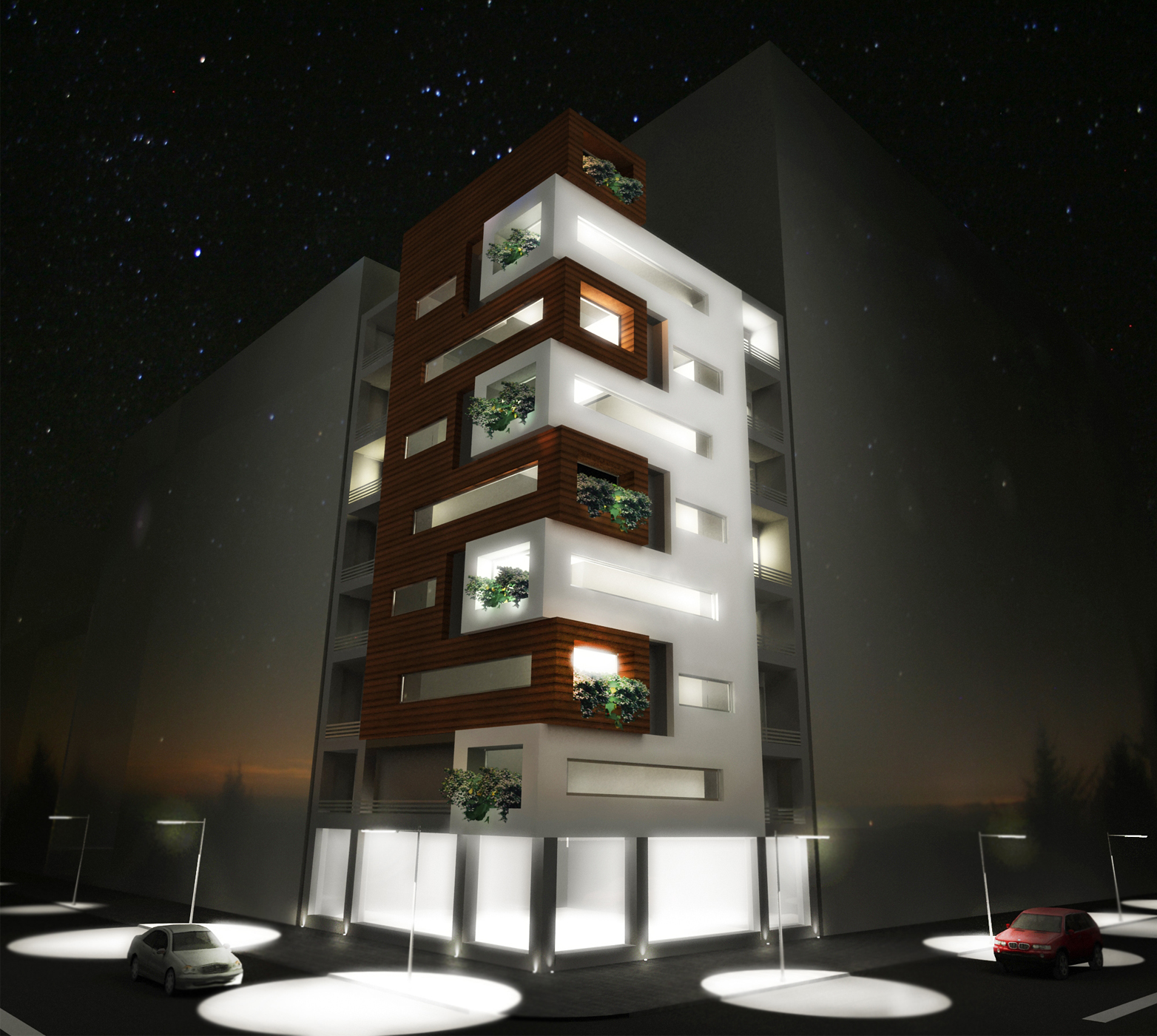 This eight-story mixed-use building redefines an urban corner through a clean, contemporary composition of geometric forms and layered materials. The ground floor hosts commercial spaces that activate the street level, while the upper levels accommodate residential apartments organized around efficient layouts and natural light. The façade’s rhythmic interplay of recessed frames and wooden textures creates depth and character, offering a dynamic visual identity both day and night. Integrated planters soften the modern lines, enhancing the building’s environmental and aesthetic quality, and making it a distinctive landmark within the dense urban fabric.