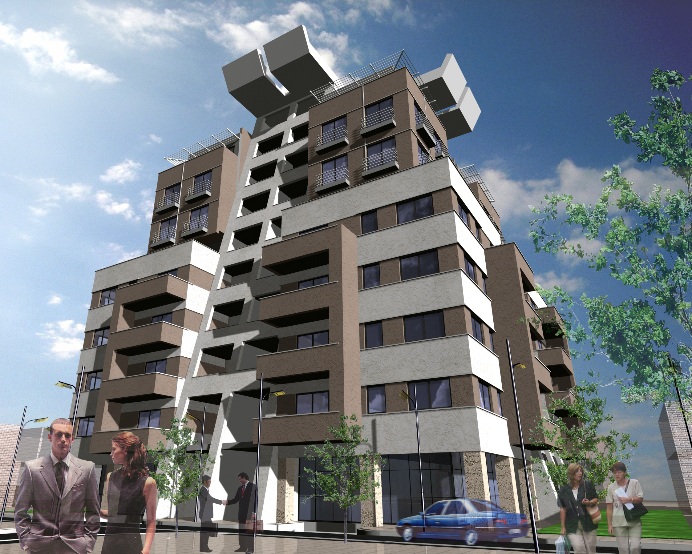 This ten-story mixed-use building stands out through its dynamic volumetric composition and sculptural form. The design plays with staggered terraces, angled planes, and protruding volumes that break the rigidity of the urban block. A strong central vertical axis organizes the façade, while alternating layers of light and dark materials emphasize depth and rhythm. The upper floors culminate with cantilevered elements that create a striking skyline profile, giving the building a sense of upward motion and architectural boldness. At street level, commercial spaces activate the pedestrian front, while the residential units above enjoy generous balconies, natural light, and panoramic views, blending geometry, function, and urban presence into a cohesive architectural statement.