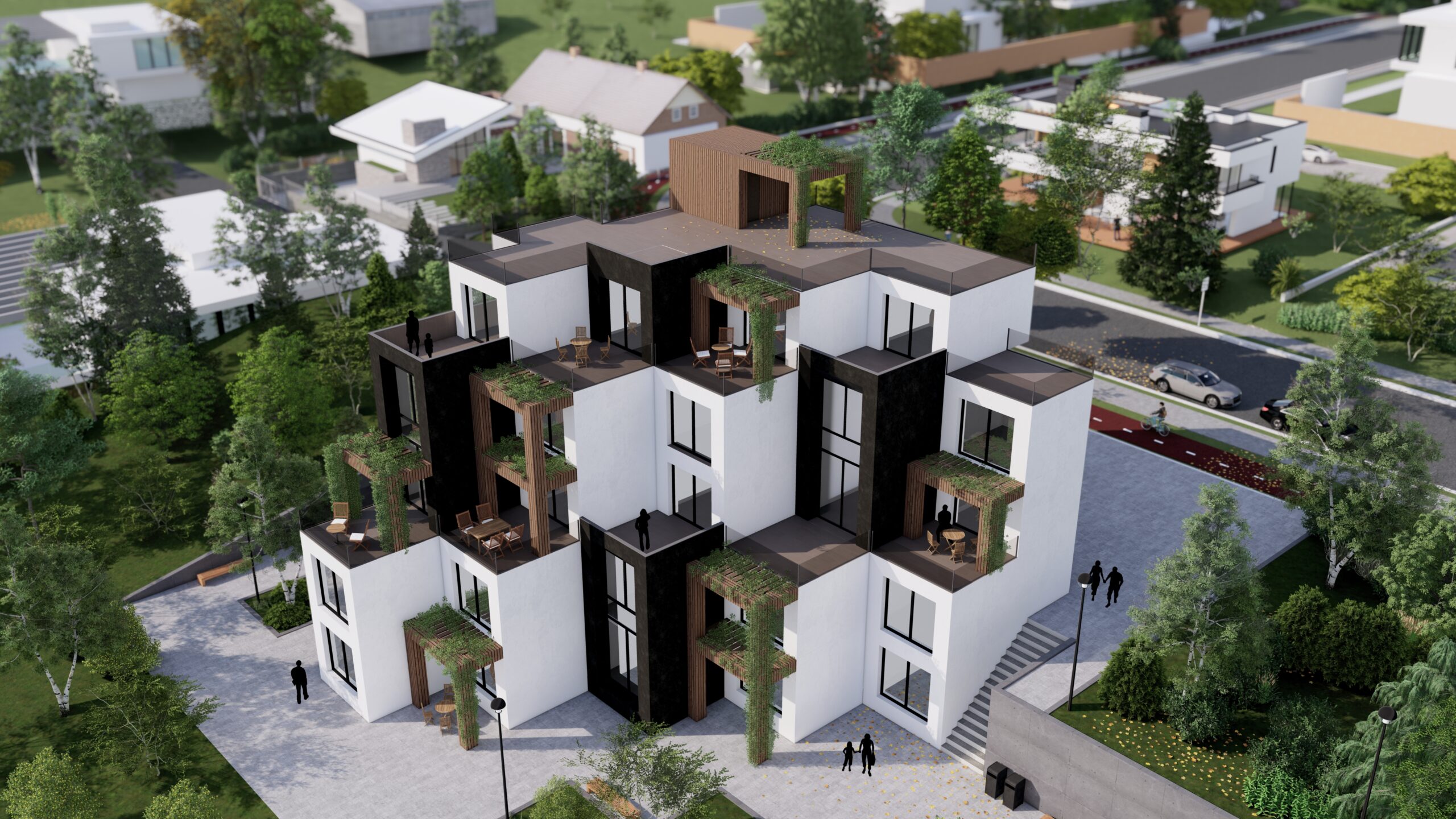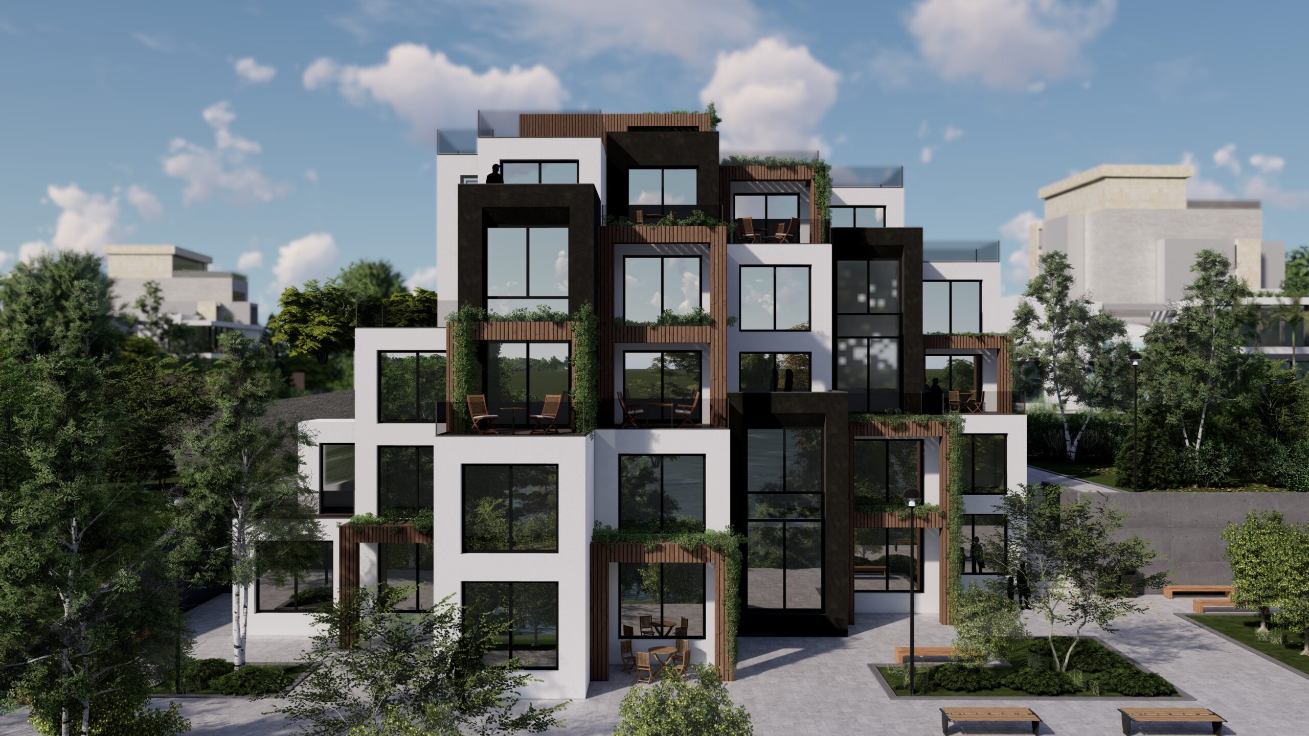 Each unit is enriched with private terraces and balconies, many of which incorporate vertical greenery and planter boxes, seamlessly blending architecture with nature. The staggered arrangement of volumes allows for natural light penetration from multiple directions, maximizing views and creating a sense of openness.