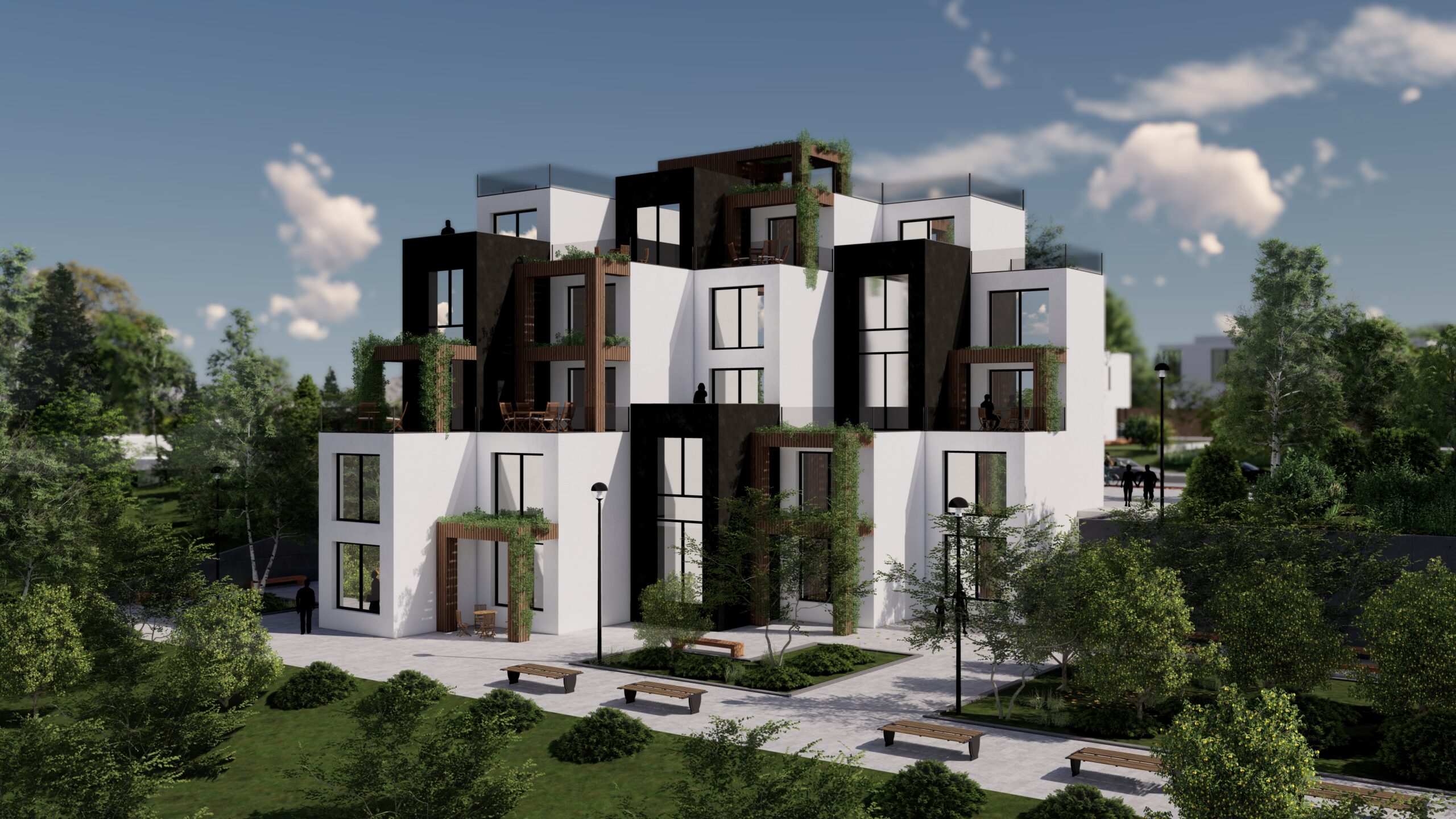 The ground level integrates the housing with a landscaped public plaza, furnished with benches, trees, and pathways, fostering community interaction and pedestrian comfort. The design emphasizes sustainability and livability, merging modern architectural aesthetics with ecological awareness.