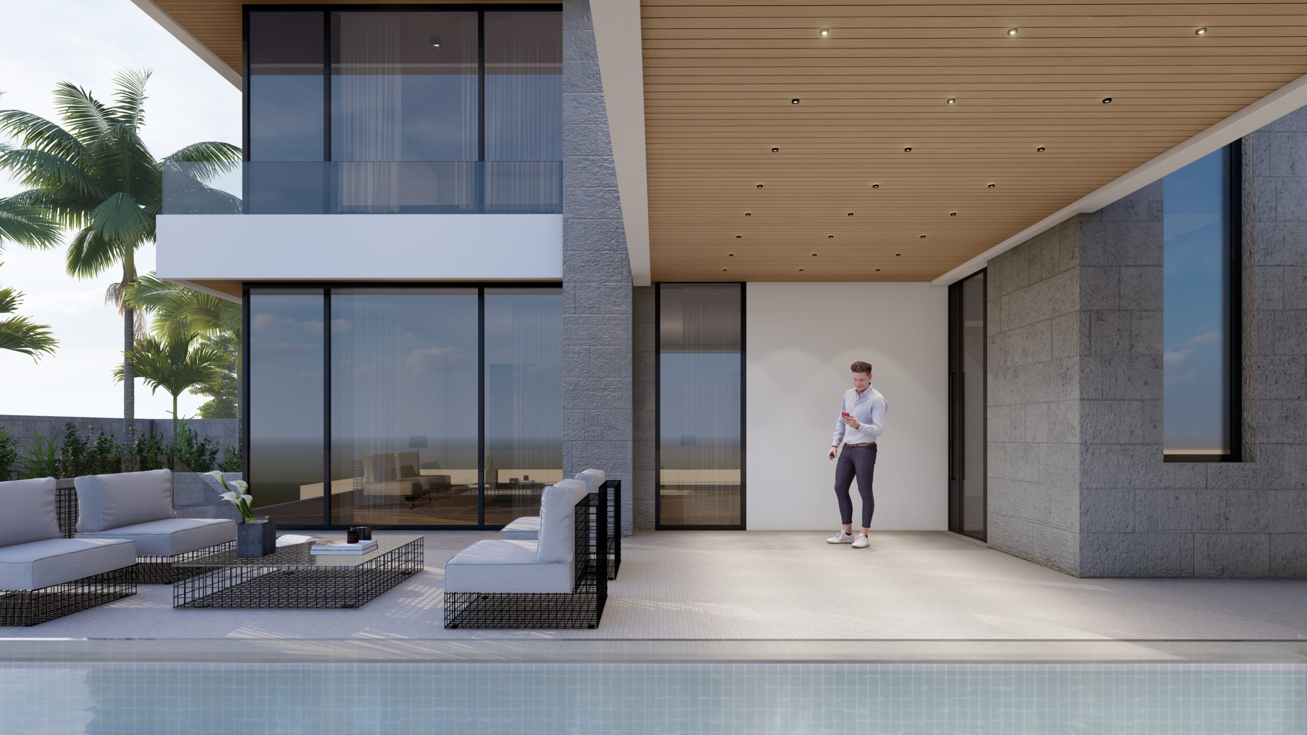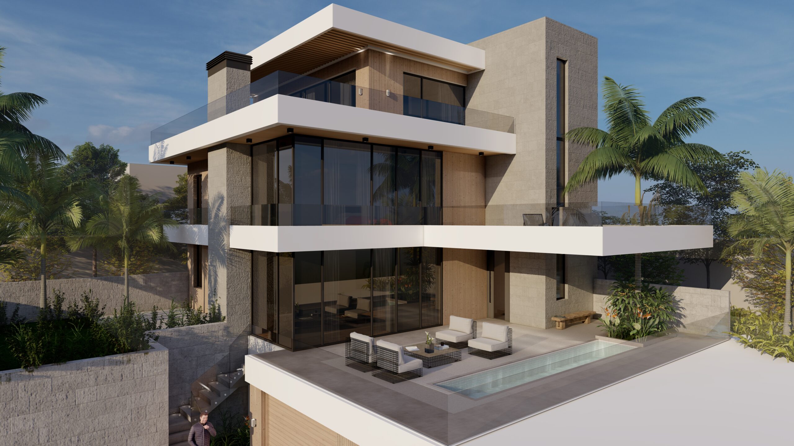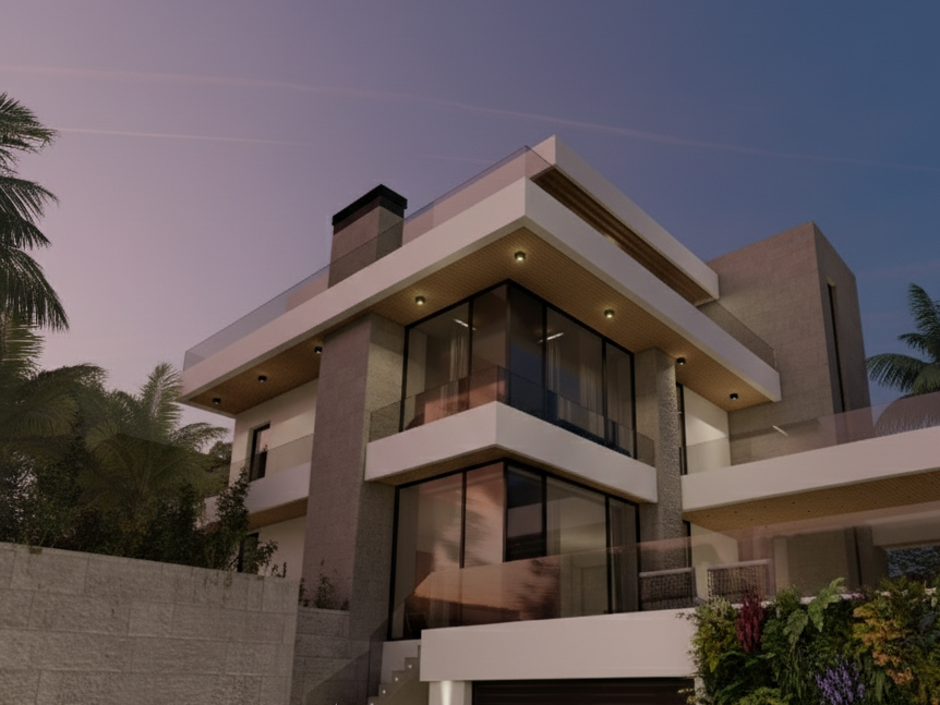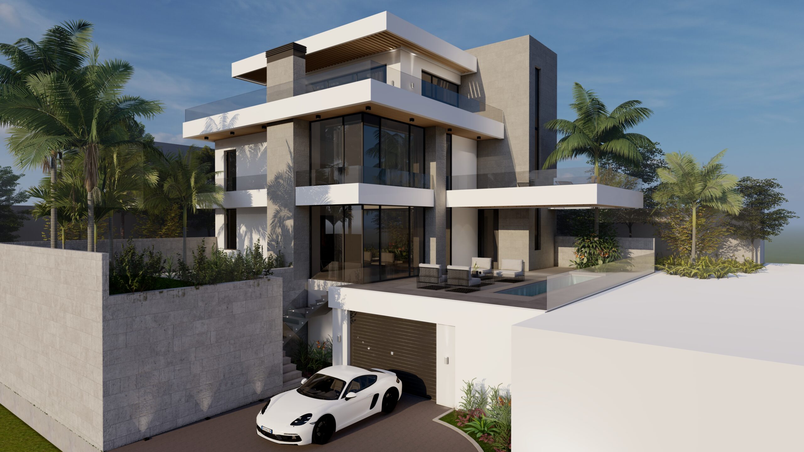 This contemporary villa is defined by clean geometric lines, expansive glazing, and the seamless integration of indoor and outdoor living. The interplay of concrete, glass, and white volumes creates a bold yet refined aesthetic, while generous terraces and cantilevered balconies maximize natural light and panoramic views. Surrounded by lush greenery and anchored by a private pool, the design balances openness with privacy, offering a sophisticated retreat that merges modern elegance with functional comfort.