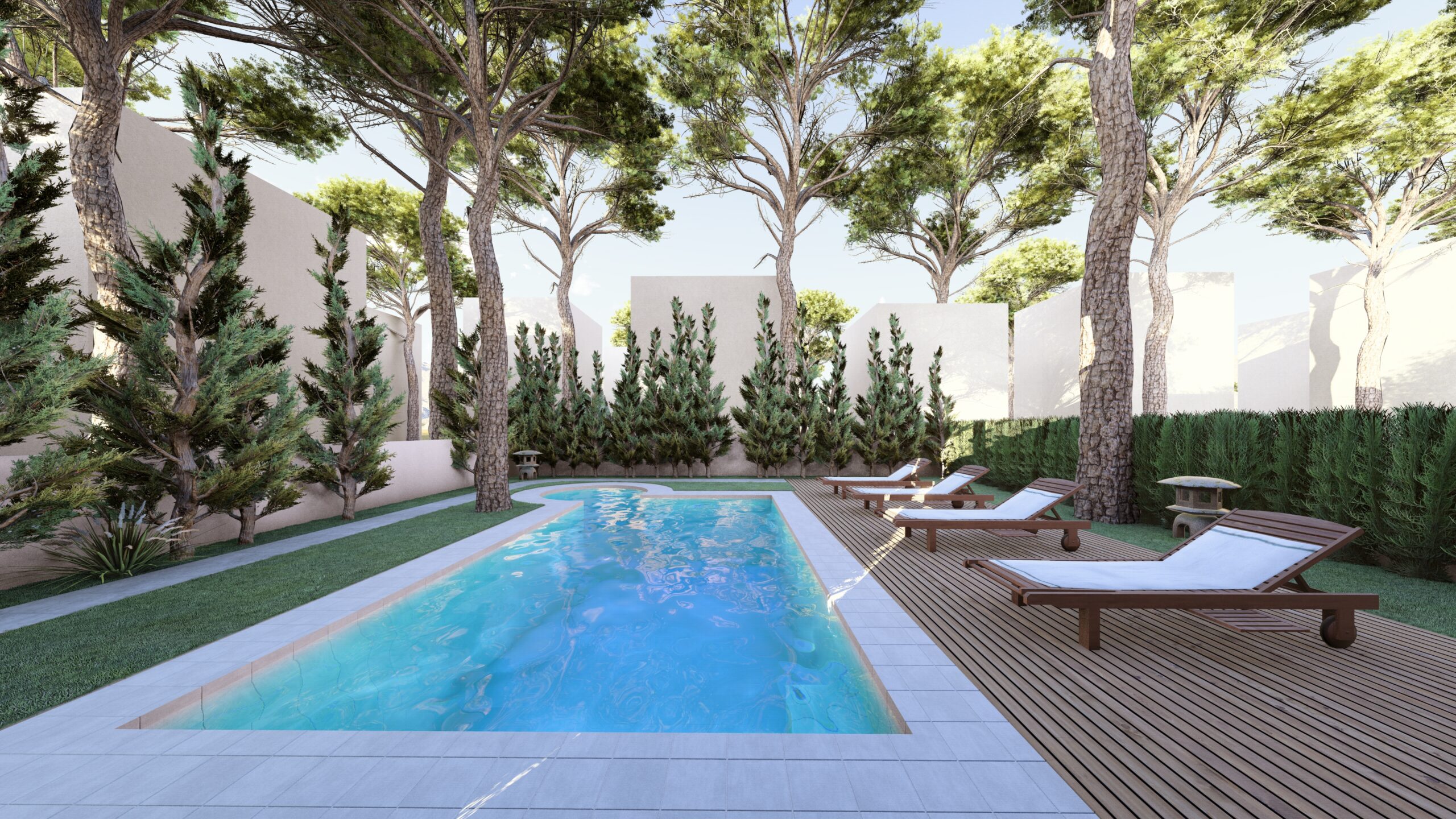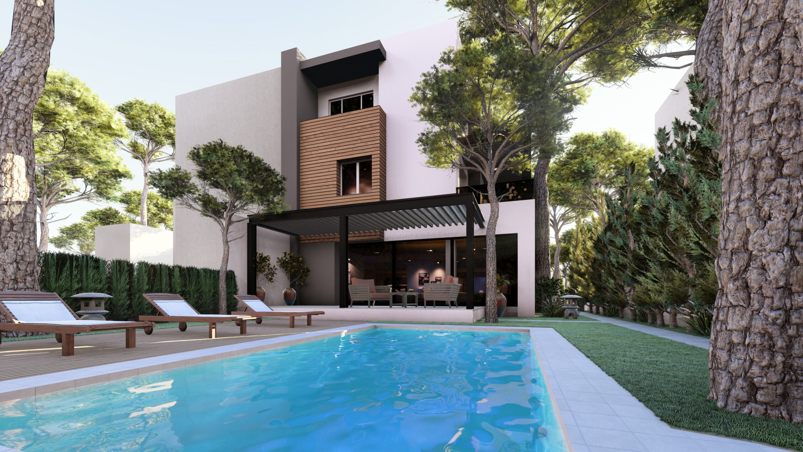 • Garden side: full-height glazing, pergola with louvers, and a timber pool deck for seamless indoor–outdoor living.