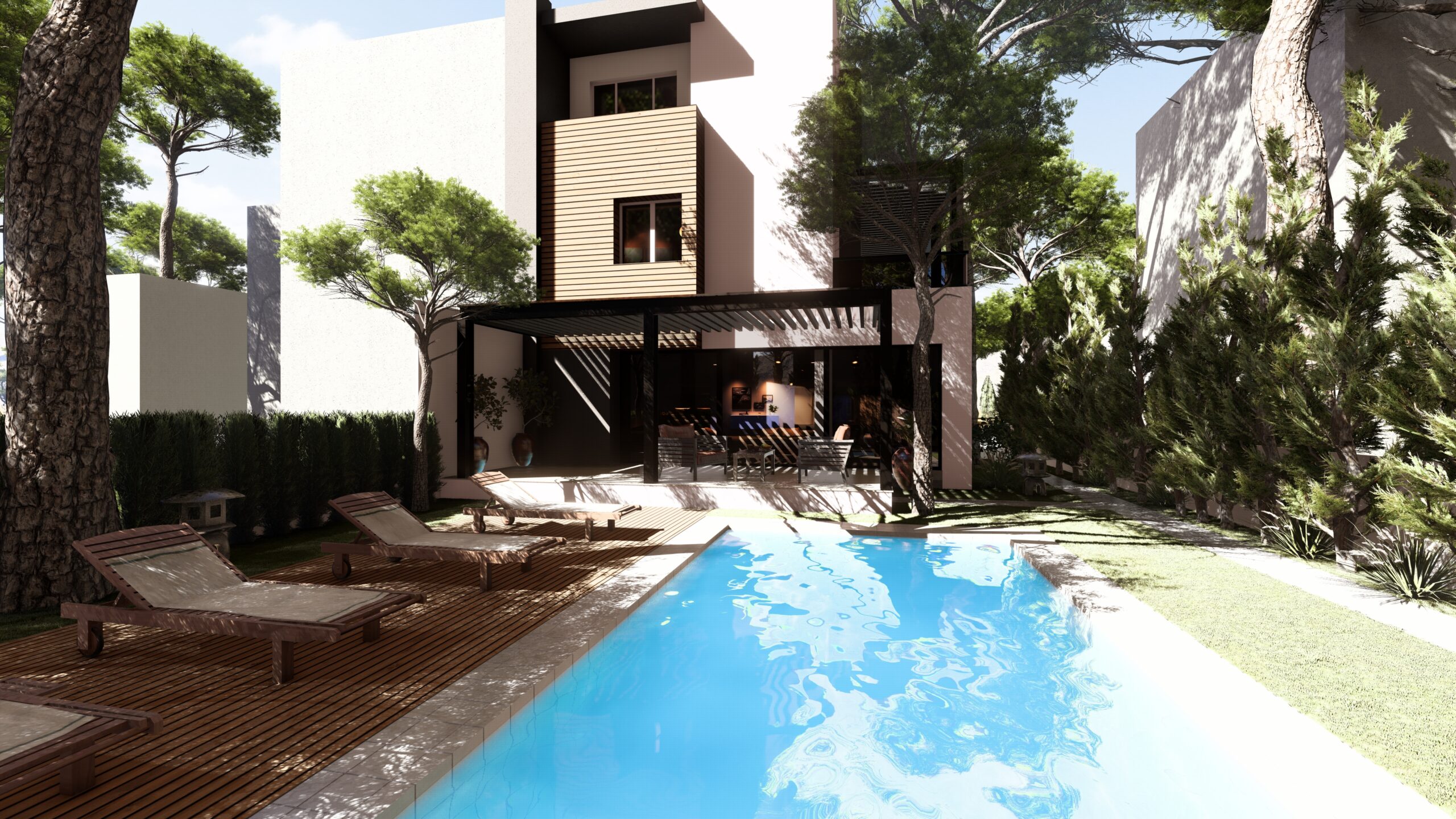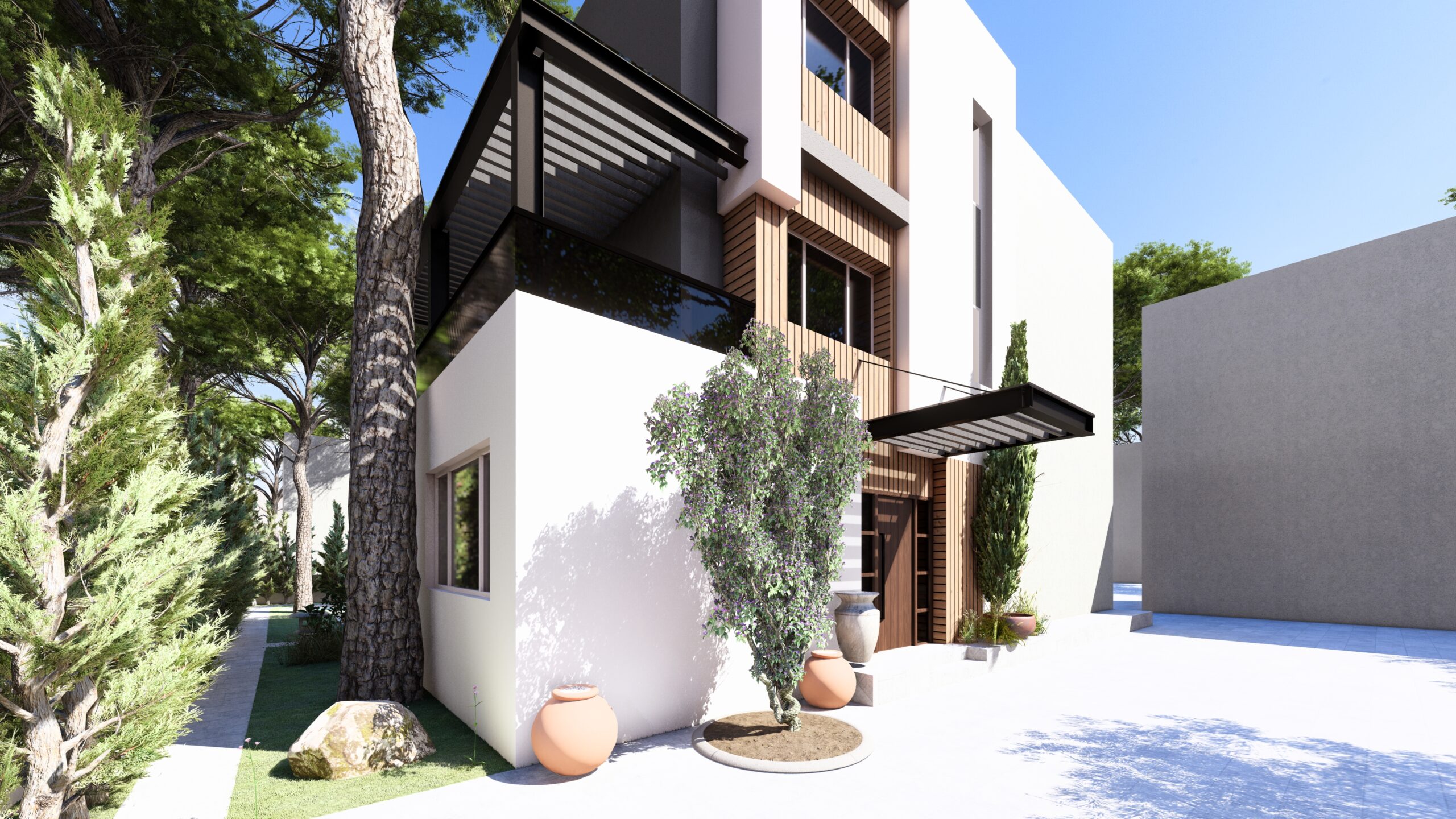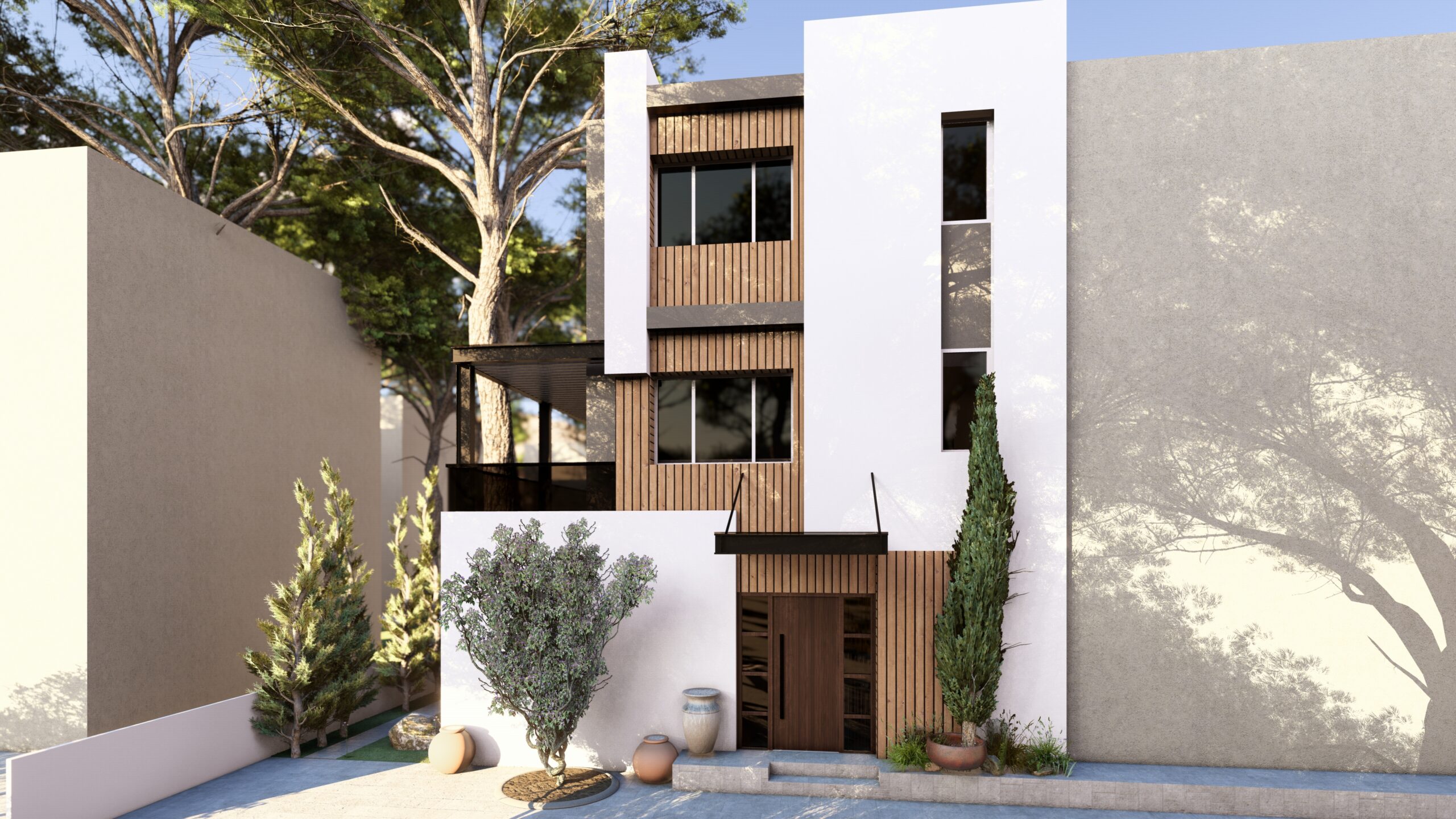 Villa Basho is a compact three-story home tailored to a narrow urban plot. The design opens the house to a private back-garden with a pool and pergola, while the street façade remains calm and well-shaded. A warm palette of timber slats, light render, and dark metal accents gives the house a contemporary Mediterranean character.