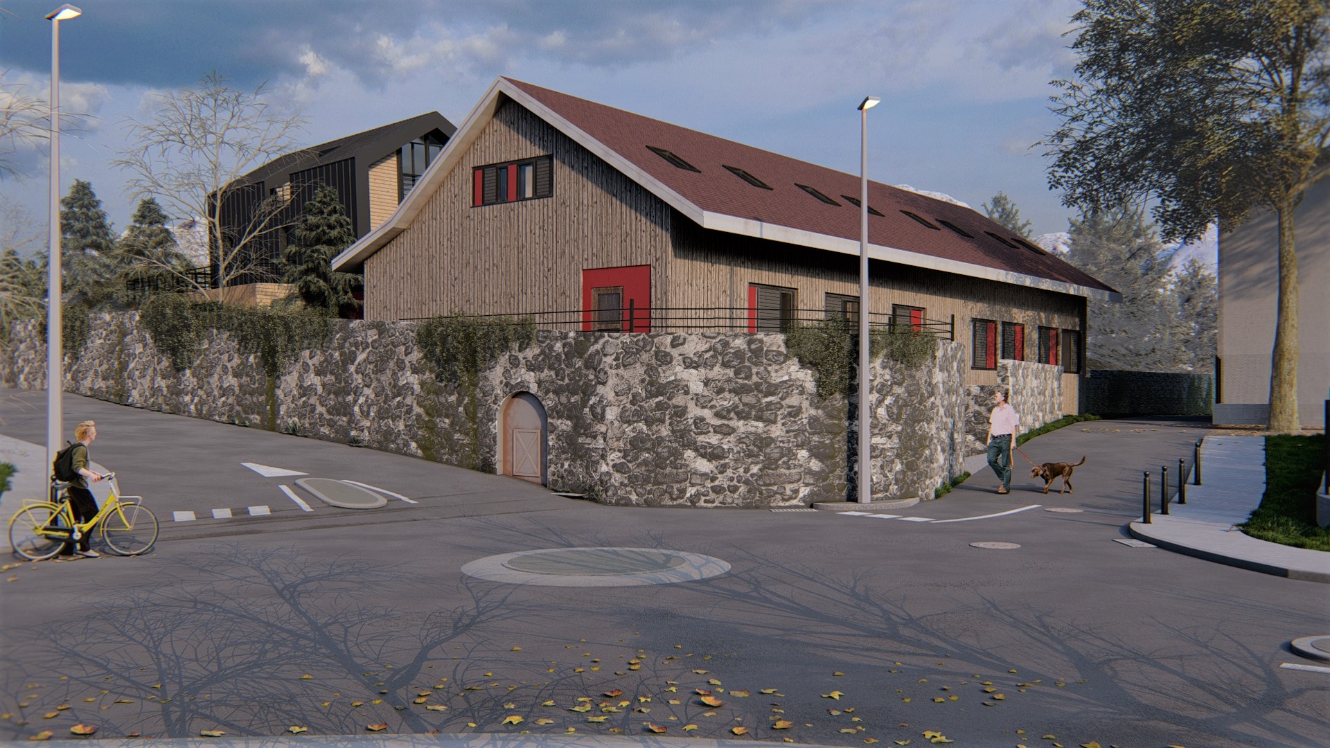 The project is located in Aix-les-Bains, a picturesque small town nestled between Lyon and Geneva. It is situated in a neighborhood characterized by two to three story villas, on a flat terrain surrounded by existing stone walls, which have been preserved along with the pre-existing fruit trees and large pine trees.